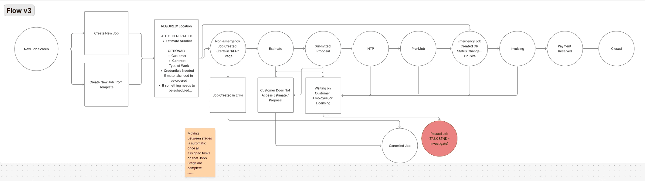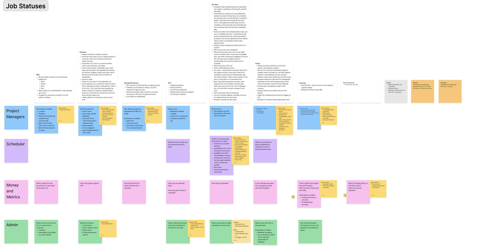 I mapped out each stage of the job, as well as three unique statuses jobs could fall into (Closed, Cancelled, and Paused). The above image shows these stages in white. I then broke down what people would touch in different aspects of the job (charted out by different coloured squares - blue, purple, pink, and green). I wrote down what each person needed to do at that Stage in order for progression to happen.
