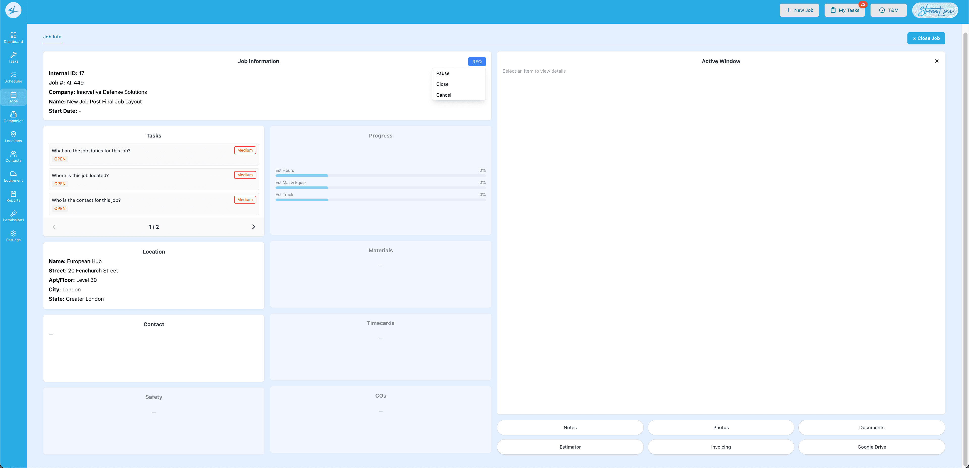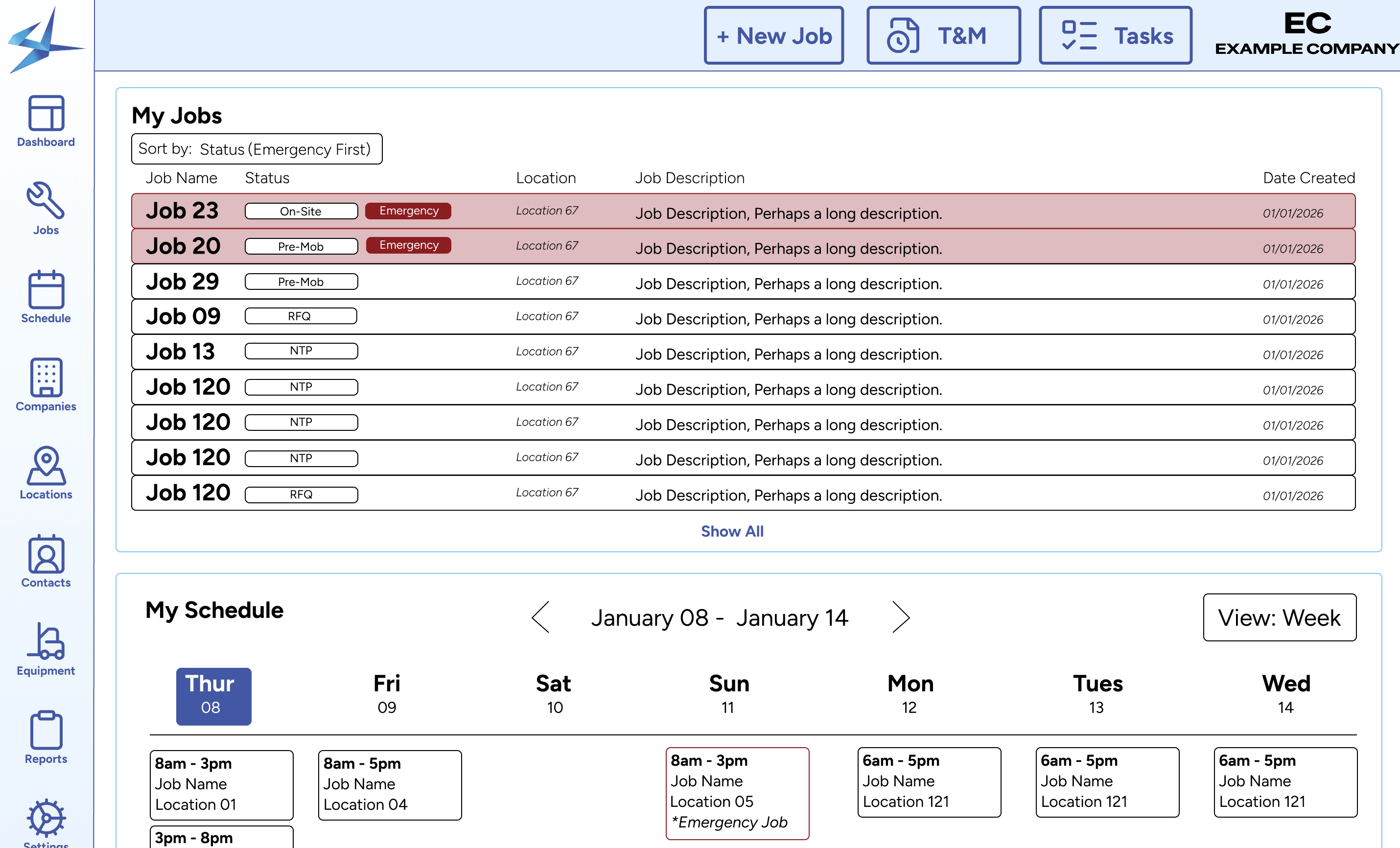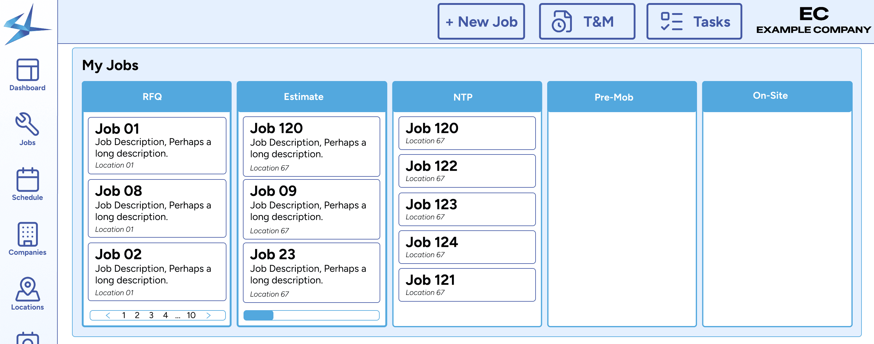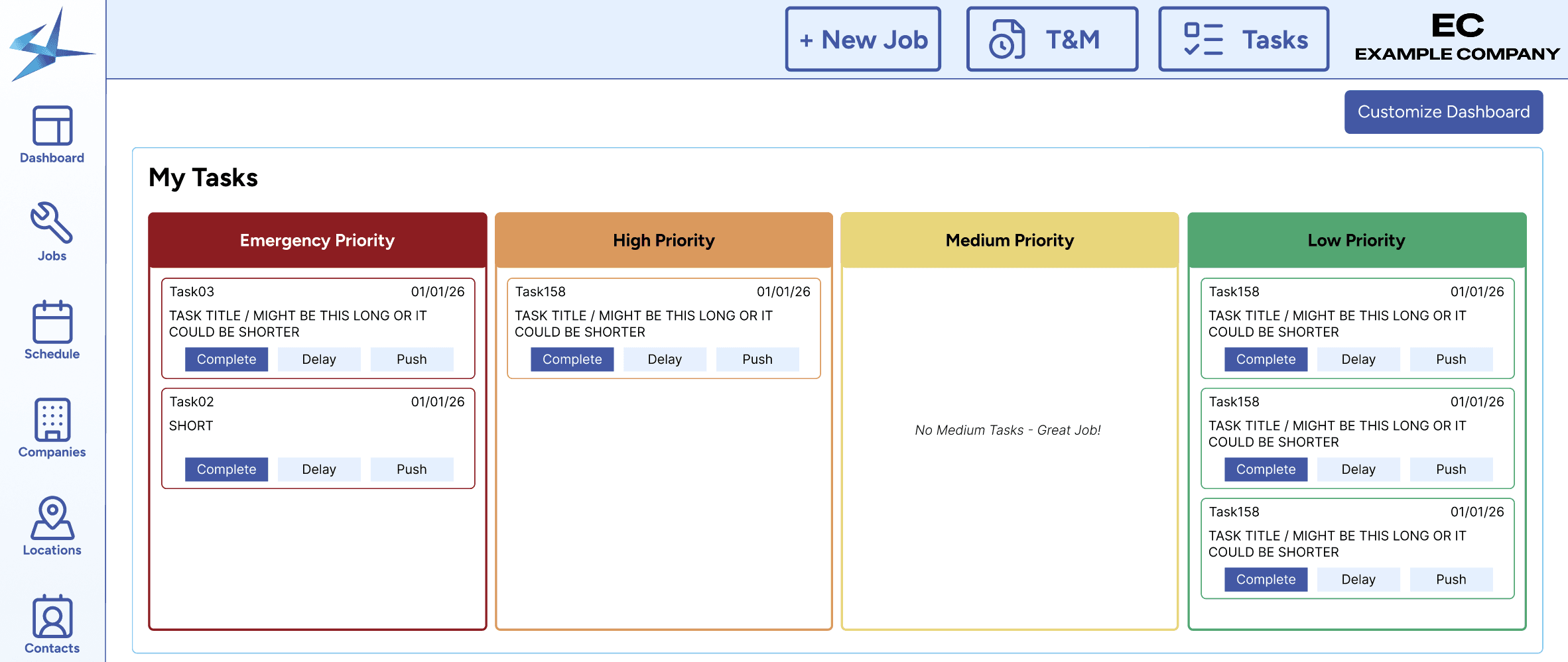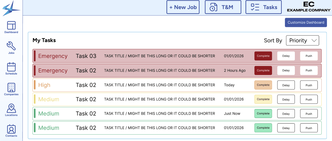 The final outcome is a Jobs screen for tracking entire job life cycle and a customizable dashboard with tasks, jobs, schedule, and more. Users use tasks to move through different job statuses in order to progress in their jobs.