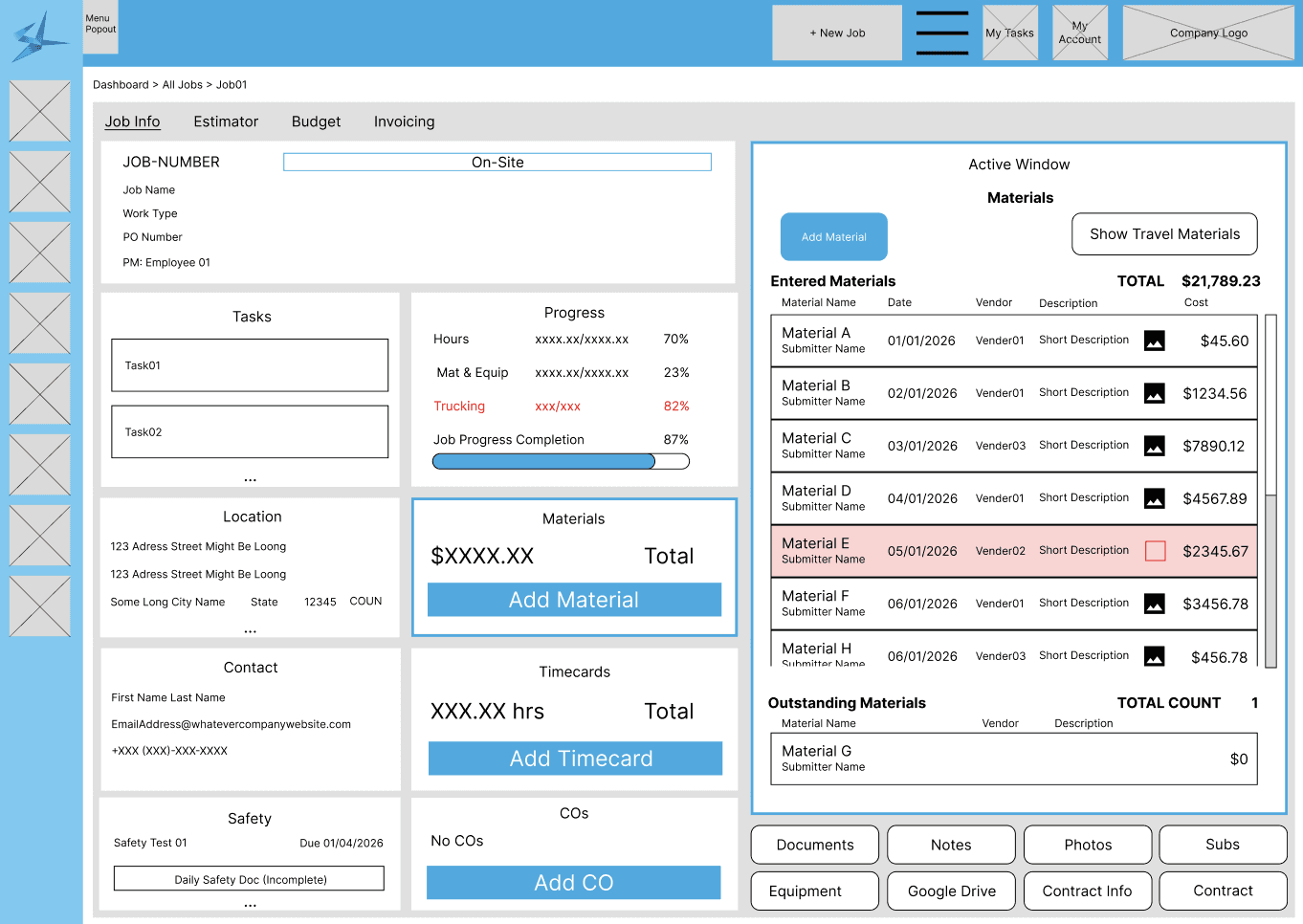 Different views were created depending on your user type to further condense the Jobs screens without leaving out information. Project Managers see cards that are relevant to tracking the amount of materials, time cards, and overall progress on a job. Office Admins see materials, contract information for customers, and more detailed time cards as they track both the customer and internal employees.