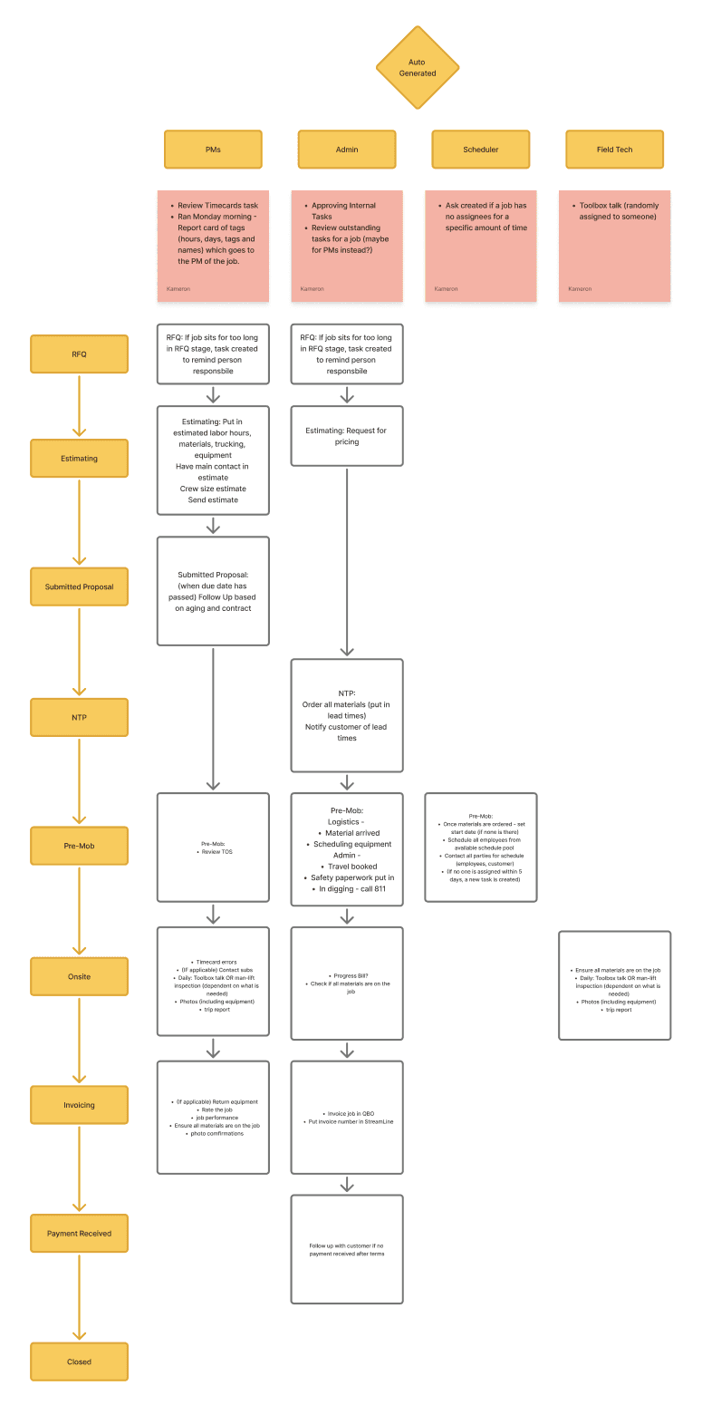 Another major change to the process was utilizing an automated system that created objectives for users based on their permission levels and the stage their assigned jobs were in. This was labeled as the "Task Manager". With discussions with the stakeholder I mapped out every critical task that user types would need to complete in order to automatically move the job into the next stage.