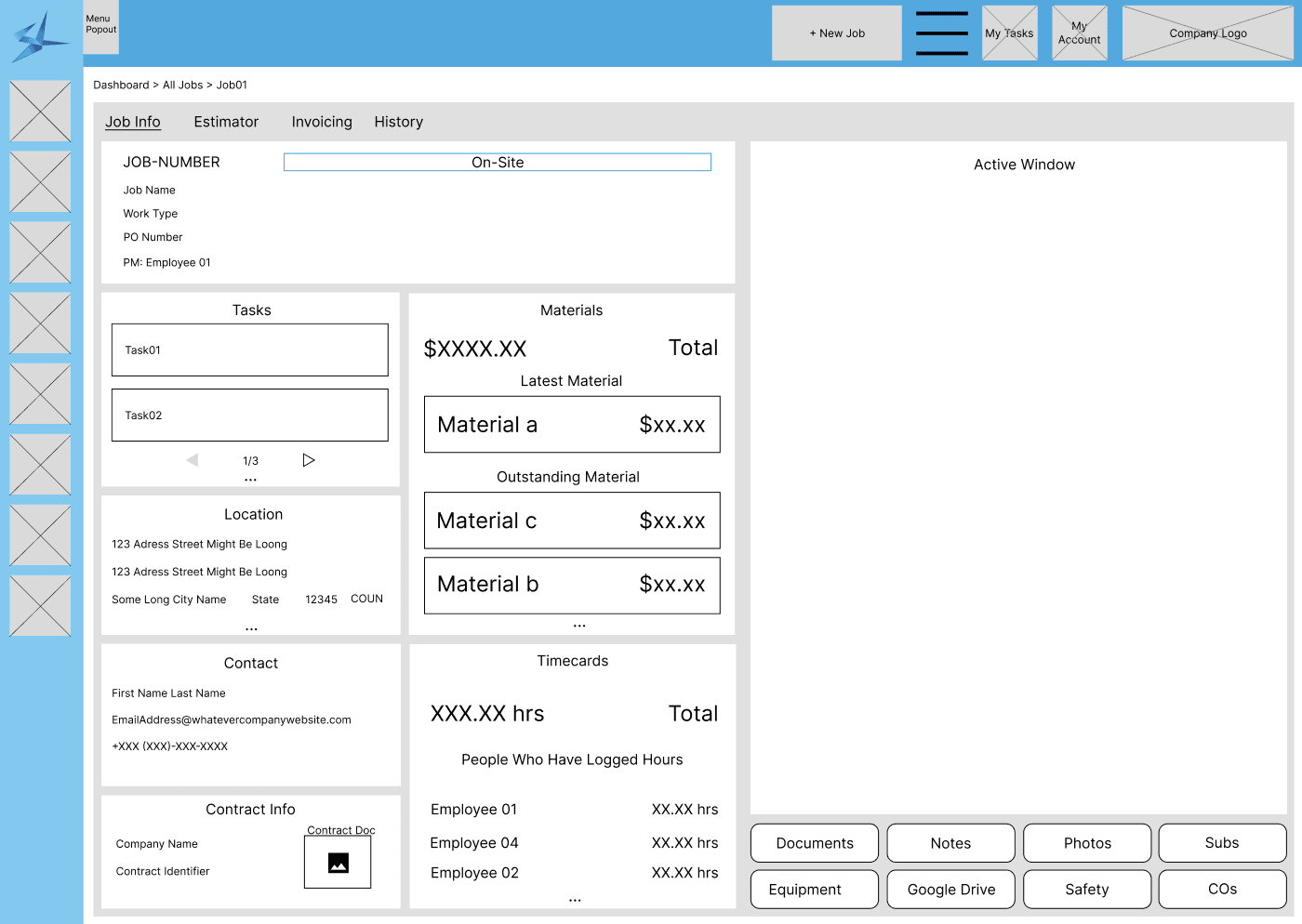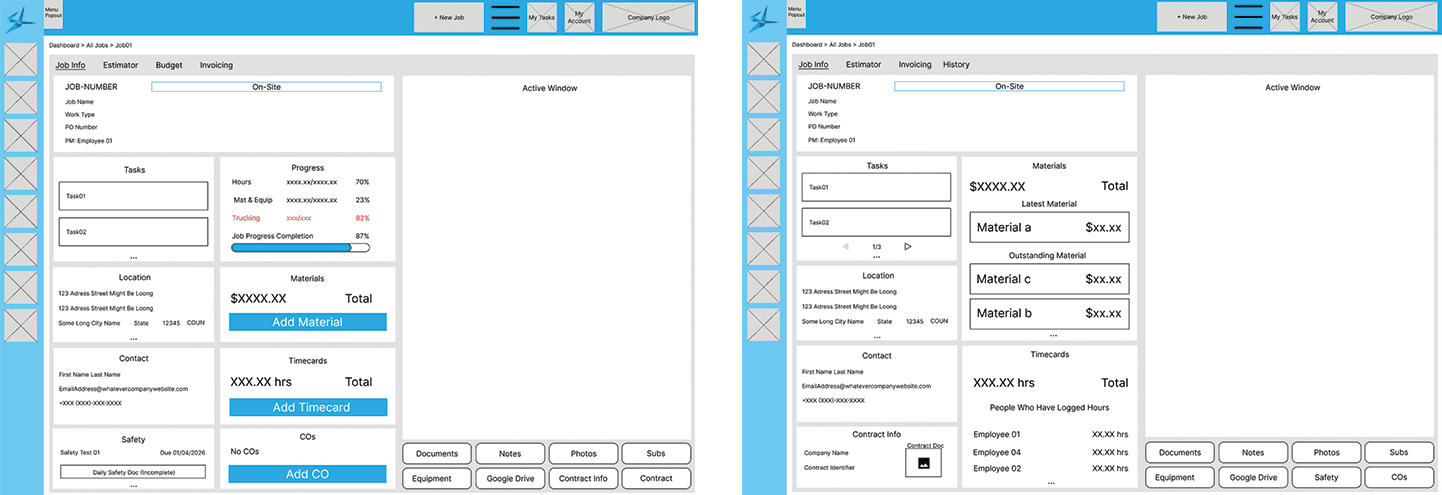 Next was the wire framing. There was some debate about how information would be presented in Jobs. The stakeholder initially wanted each stage to look completely different, with unique information displayed that was relevant to that change, but that was going to be confusing for users as they would have to learn a new layout every time. I created a system that displays relevant cards that acted as summaries, with and "Active Window" on the right that would display a detailed view of whatever card was currently selected. That way you would always have relevant information but not get lost in having too much displayed at a time. Throughout the process of Jobs moving to stages, different cards would "unlock" and start filling in with information - always there not always able to be selected.